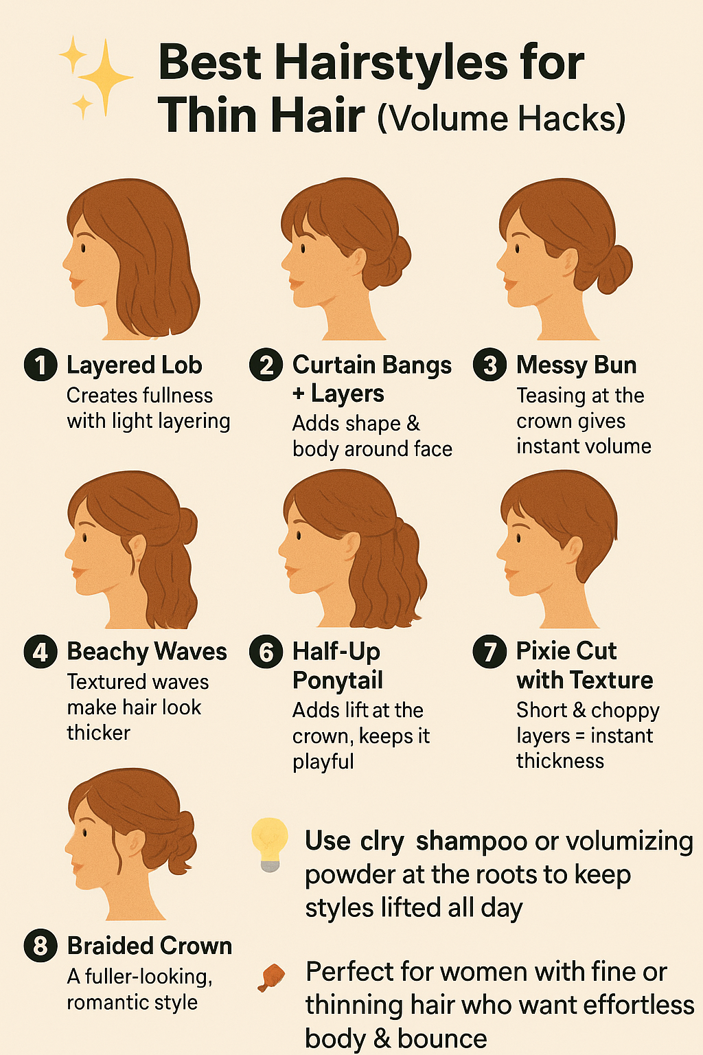 Struggling with fine or thin hair? These 8 trending hairstyles are perfect for women in the USA & Canada who want effortless volume, bounce, and fullness. From layered lobs and curtain bangs to beachy waves, messy buns, and pixie cuts — discover the most flattering looks that make thin hair appear thicker. Use these hairstyle hacks with dry shampoo or volumizing powder to keep your style lifted all day. Save this pin for your next salon visit! #ThinHairSolutions #HairstylesForThinHair #VolumeHairHacks #HairTipsUSA #HairTipsCanada #WomenHairCare #Hairstyles2025 #BeautyTipsForWomen #VolumeBoostHair #HairInspiration