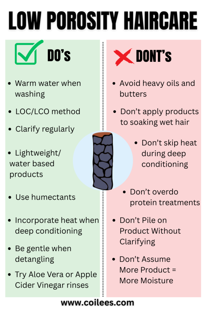 Struggling with dry, stubborn hair? Learn the top do’s and don’ts for low porosity hair – including how to moisturize, what type of products to avoid and tips to keep your natural hair healthy, soft, and defined. Perfect for curly, coily and textured hair types! Click to read the full low porosity hair care guide!