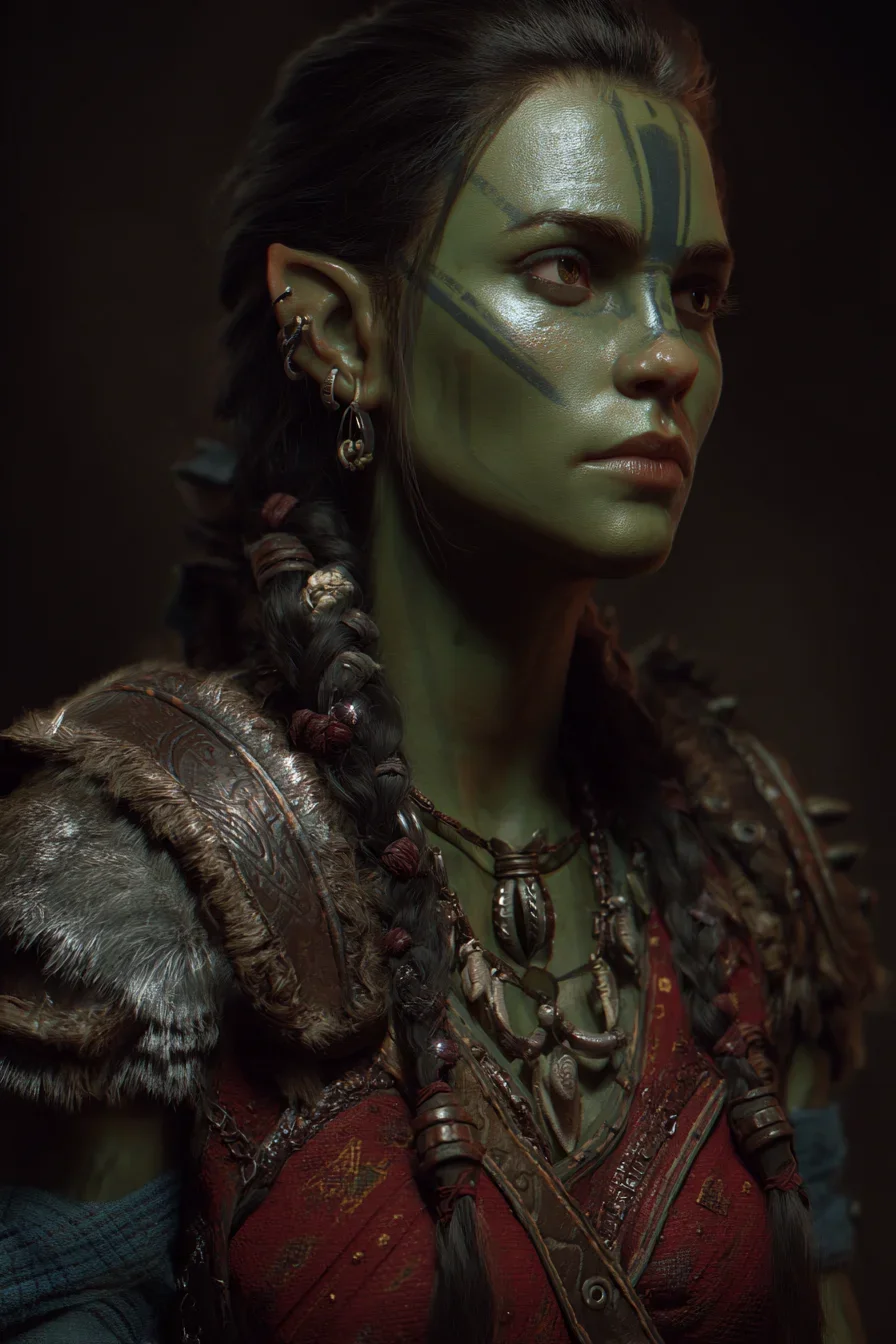 A half-orc woman gazes into the shadows, her olive skin marked with dark tribal paint and layered with feather earrings and worn beaded necklaces. Theres a quiet intensity to her profile battle-hardened but contemplative, every adornment telling a story of survival.