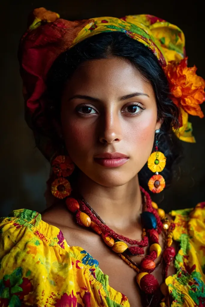A young Colombian woman wears a vivid yellow lace blouse and a layered patchwork headwrap in crimson, teal, and gold. Her oversized crocheted hoop earrings and stacked bead necklaces speak to the rich artisanal traditions of the Caribbean coast. Her calm, steady gaze carries quiet confidence.