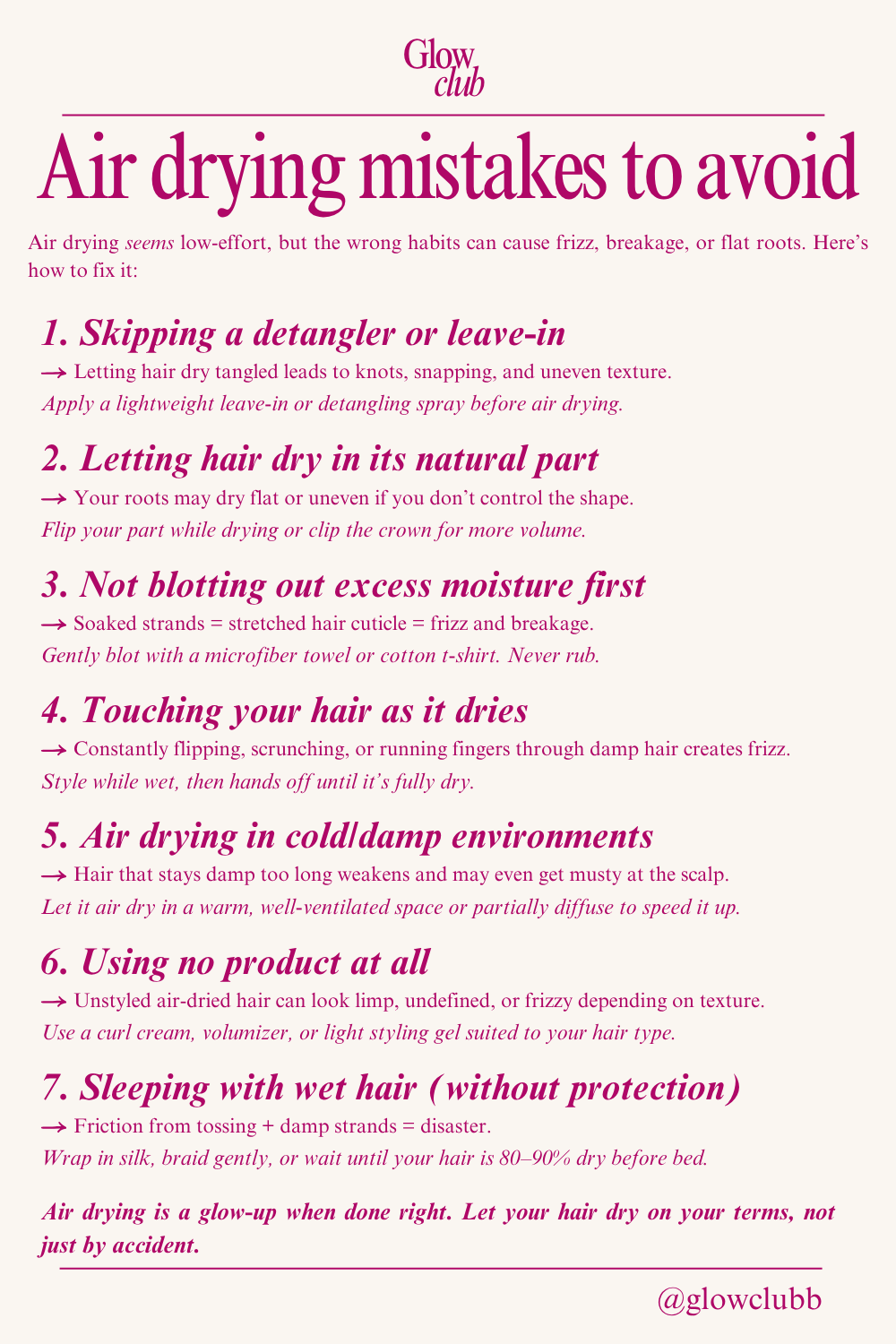 Air drying your hair can be healthy, but not if you’re unknowingly causing frizz, breakage, or flat roots. This guide breaks down 7 common mistakes people make when air drying and how to avoid them. From skipping leave-in products to sleeping with wet hair without protection, these small tweaks can make a big difference in your hair health. Don’t let your glow-up be accidental. Air dry the right way with intention and care. #HairCareTips #AirDryingHair #FrizzFreeHair #HealthyHairJourney #NoHeatHairstyle #GlowUpHair #GlowClub #NaturalHairTips #HairRoutineFix #BeautyTips #GlowUp