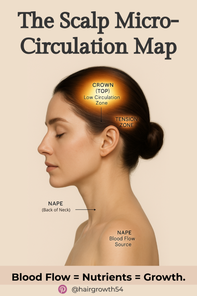 Scalp massage is great, but are you targeting the “Growth Zones”? Anatomy tells us that the “Crown” (top of the head) has the poorest blood supply, making it the most prone to thinning. Meanwhile, the “Nape” is where major arteries feed the scalp.