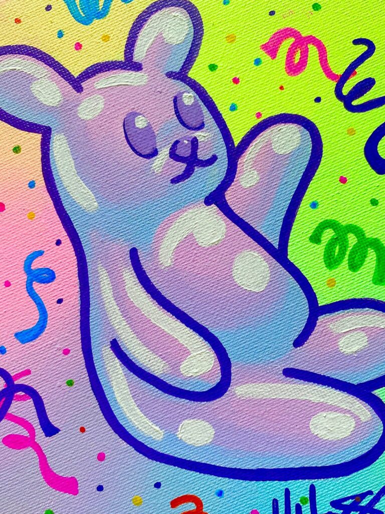 Share Facebook Twitter LinkedIn Pinterest Email Gummy bears have never been so cute! This is an acrylic painting displayed on a round stretched canvas that is 8 inches in diameter, accented with a rainbow of glossy oil paint pens.
