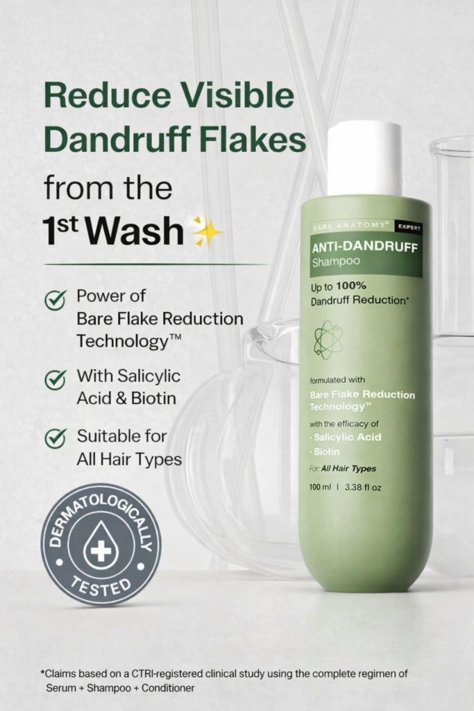 Say goodbye to stubborn dandruff with Bare Anatomy Expert Anti-Dandruff Shampoo. Powered by Bare Flake Reduction Technology™, this dermatologically tested formula helps reduce visible dandruff flakes from the very first wash. Enriched with Salicylic Acid and Biotin, it gently cleanses the scalp, controls flaking, and keeps hair healthy and refreshed. Suitable for all hair types, this shampoo supports a clean, balanced scalp with regular use.