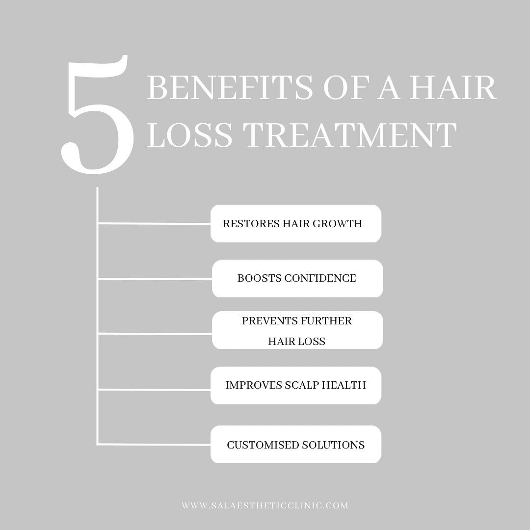 Considering a hair loss treatment? Here are five key benefits: Restores hair growth Boosts confidence Prevents further hair loss Improves scalp health Offers customised solutions Take the first step towards healthier, fuller hair with our tailored treatments. #salaestheticclinic #hairlosstreatment
