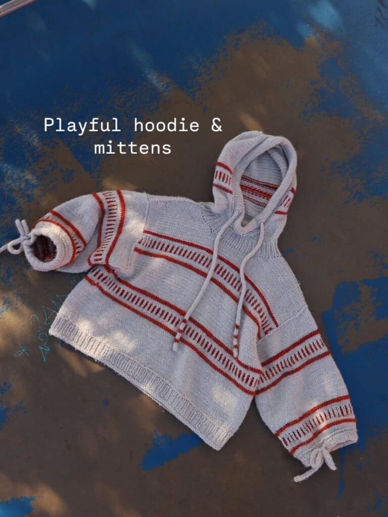 Playful Hoodie og Luffer blev skabt ud fra ideen om at kombinere fri leg med en ramme, der sikrer dig et smukt, gennemarbejdet og ikke mindst sammenhængende resultat 🌜 Sættet rummer to opskrifter: et par bløde, hyggelige luffer og en oversize hættetrøje med de fineste detaljer Hoodien strikkes oppefra og ned, så du nemt kan tilpasse længden. Den har brede, afslappede ærmer, som kan snøres ind med bånd ved håndleddet – og en stor, vamset hætte, der kan strammes lidt til med snore Pasformen …