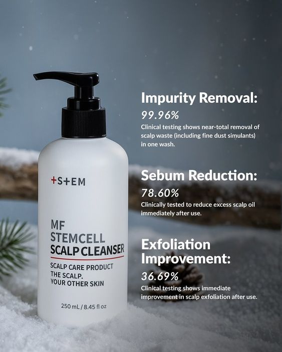 Our MF Scalp Cleanser removes 99.96% of scalp impurities in a single wash, including fine dust buildup.