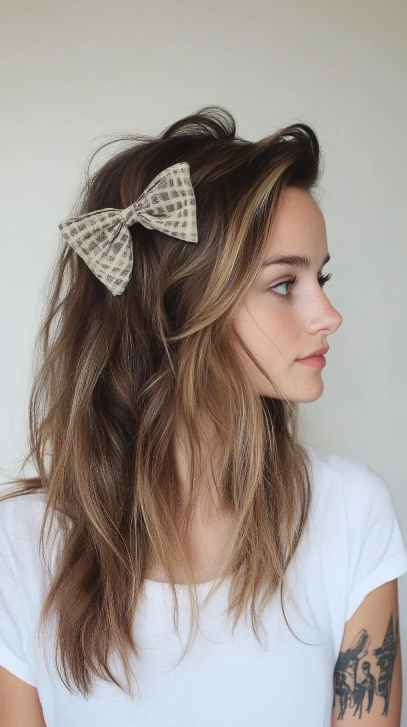 This hairstyle showcases a stunning blend of soft, tousled waves and playful elements, making it perfect for a casual yet stylish look. The cut features medium to long layers that add movement and dimension, enhancing the natural texture of the hair. The addition of a large, patterned bow accessory draws attention and adds a whimsical touch, making it ideal for both everyday wear and special occasions. The overall texture appears effortlessly tousled, creating a relaxed vibe that complements various styles. This hairstyle is particularly flattering for oval, heart, and square face shapes, as the soft waves frame the face beautifully while the layers help balance proportions. The darker roots transitioning to lighter ends also add depth and dimension, making the hair look fuller and healthier. This versatile style can be easily dressed up or down, allowing for a personalized touch with minimal effort.