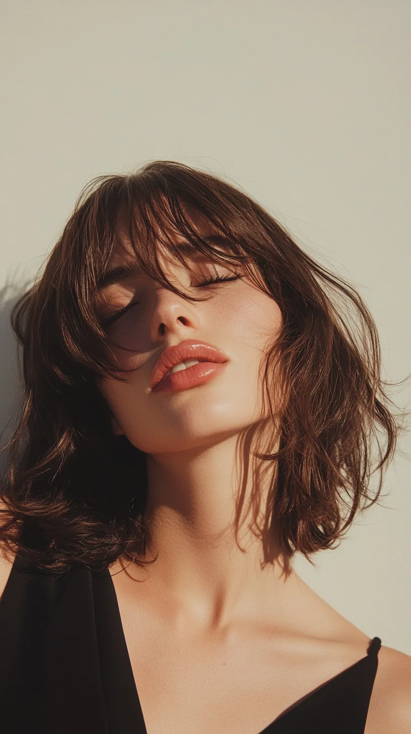 This hairstyle features a beautifully tousled texture that exudes effortless chic and modernity. The soft, wavy layers create volume and movement, framing the face delicately. The addition of flirty bangs adds a playful touch, enhancing the overall youthful vibe of the look. This versatile cut works wonderfully on medium to long hair, allowing the natural texture to shine through while maintaining an air of sophistication. The depth of the dark hair color accentuates the waves, providing contrast and dimension. This style is particularly flattering for oval, heart, and square face shapes, as the layers can soften angular features and highlight the cheekbones. Additionally, the bangs can help to balance a wider forehead, making it an excellent choice for various face shapes. Perfect for casual outings or more polished events, this hairstyle is a go-to for those seeking a low-maintenance yet stylish option.