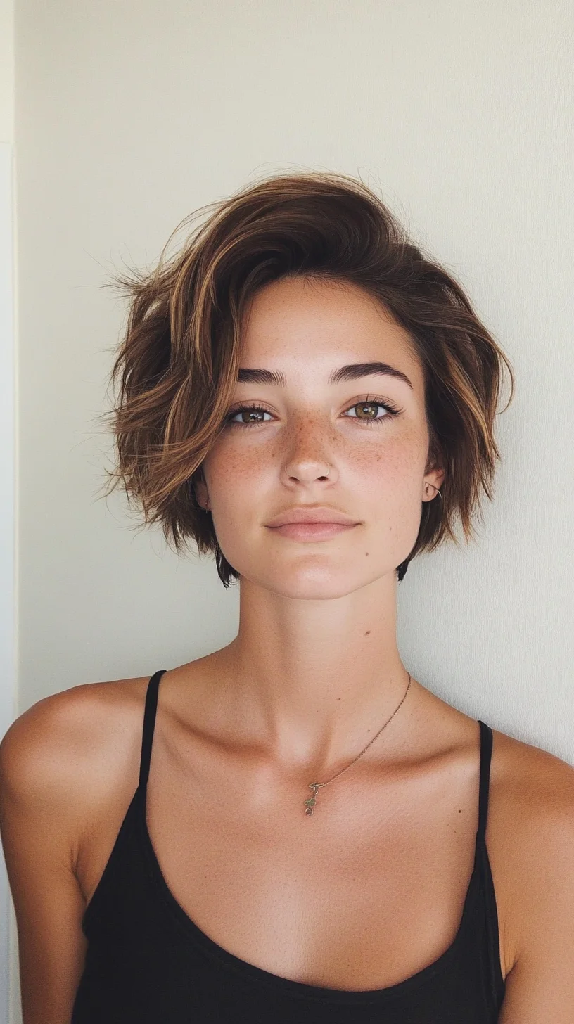 This hairstyle features a chic textured bob that exudes effortless elegance and modern style. The cut is characterized by its soft layers and a slightly tousled finish, creating a look that is both playful and sophisticated. The hair is cut to chin length, accentuating the jawline while maintaining a soft, feminine silhouette. With its natural waves and volume, this style offers a relaxed vibe that can easily transition from casual to formal settings. The subtle highlights add depth and dimension, enhancing the overall texture and movement. This bob is particularly flattering for oval, heart, and square face shapes, as it brings balance and highlights the features beautifully. The tousled look is perfect for those seeking low-maintenance styles that still pack a punch. Ideal for any hair type, this versatile cut can be styled straight, wavy, or with added curls for a more glamorous appearance.