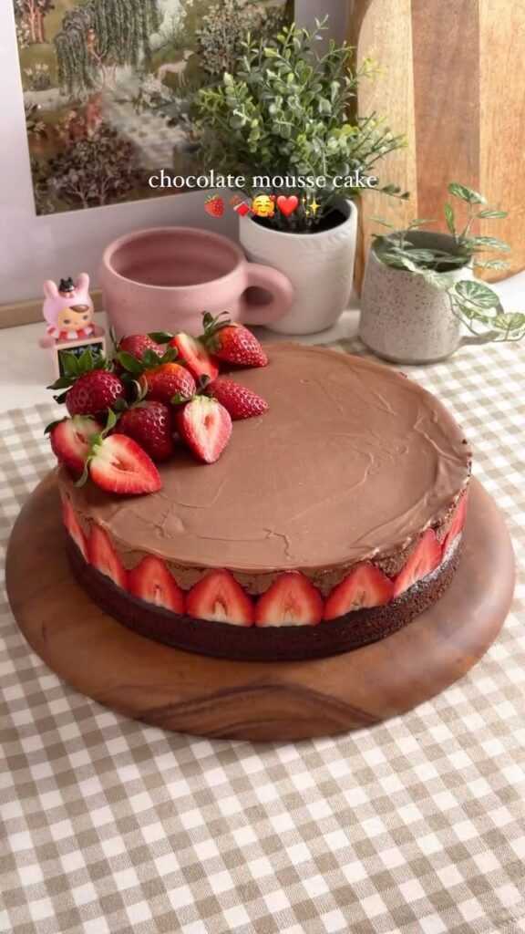 This chocolate mousse cake is made with three decadent layers of chocolate. There’s a layer of soft and moist chocolate cake, a whipped chocolate mousse, and fudgy chocolate ganache on top. It’s finished off with fresh strawberries for a pop of colour and fruity flavour!