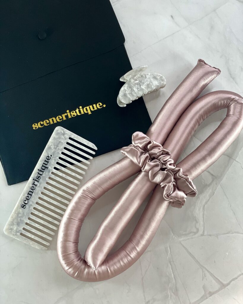 Let the trend convince you with our Heatless Curl Set. This allows you to effortlessly conjure up waves or curls without heat and without damaging your hair. In contrast to a dressing gown, tie, socks, etc., you can use our hair band made of 100% pure 22 momme silk to take care of your hair and even eliminate hair breakage and frizz. Let yourself be convinced! Contents: 1x Silk Hair Curler 2x silk scrunchies 1x comb 1x hair clip 1x travel bag