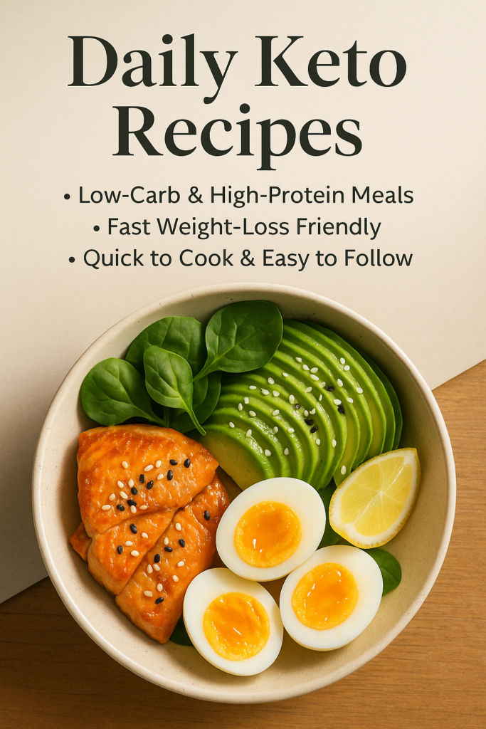 “Discover easy daily keto recipes made with clean, low-carb and high-protein ingredients. This bowl includes salmon, avocado, boiled eggs, and fresh greens — perfect for fast weight loss, stable energy, and a simple keto lifestyle. Ideal for beginners who want quick, delicious, and easy-to-follow keto meals.”