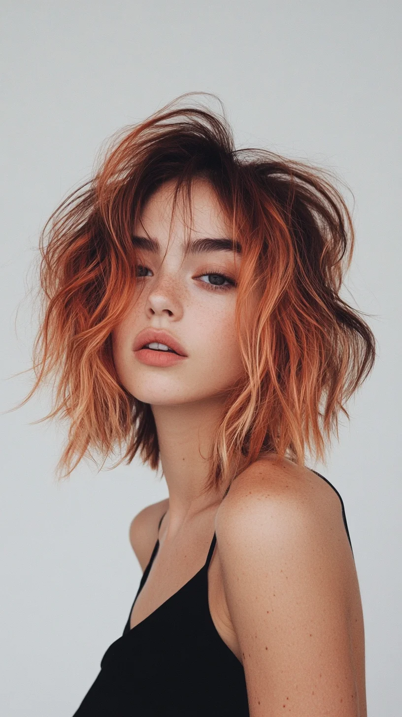 This hairstyle features a modern textured wavy lob, blending playful waves with vibrant, fiery highlights that add depth and dimension. The cut falls just above the shoulders, offering a fresh and versatile look perfect for various occasions. The layers enhance movement, creating a lively, tousled effect that exudes a carefree vibe. The warm orange hues beautifully contrast with the natural hair color, making it an eye-catching style. This haircut suits a variety of face shapes, particularly oval, heart, and round faces, as the soft waves frame the face while the length elongates the neck. The texture allows for easy styling, whether air-dried for a casual look or styled with a curling iron for added definition. Ideal for those seeking a low-maintenance yet stylish option, this lob can be adapted to suit both casual and formal settings. Overall, it embodies a perfect balance of sophistication and playfulness, making it a go-to choice for fashion-forward individuals.