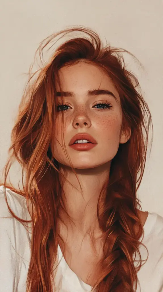 This hairstyle is a perfect blend of bohemian charm and effortless elegance. It features a loose braid that cascades down one side, adding a touch of whimsy to the overall look. The hair is styled with soft, flowing waves that evoke a sense of natural beauty and movement. The texture is slightly tousled, enhancing the laid-back vibe while showcasing the rich, warm tones of the hair. This style is particularly flattering for oval and heart-shaped faces, as the soft waves frame the face beautifully, softening angular features. The braid not only adds visual interest but also keeps hair neatly styled, making it ideal for both casual outings and more formal occasions. Overall, this hairstyle embodies a carefree spirit, perfect for anyone looking to convey a sense of effortless beauty and style.