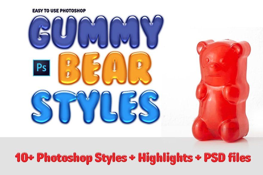 Easy Gummy Bear Styles for Photoshop. Using a unique two layer style you can easily create gooey, gummy text or icons with just a few clicks. Included in the package: Gummy Bear Styles for Photoshop Cs6+ with 10 different editable styles – Gummy Bear Styles layered Photoshop file with all 10 styles in layers Shine Photoshop file – add stars and glints to your 3d text to make it shine Non-Destructive layered actions gives you the ability to change and edit to work with your document size Walkt