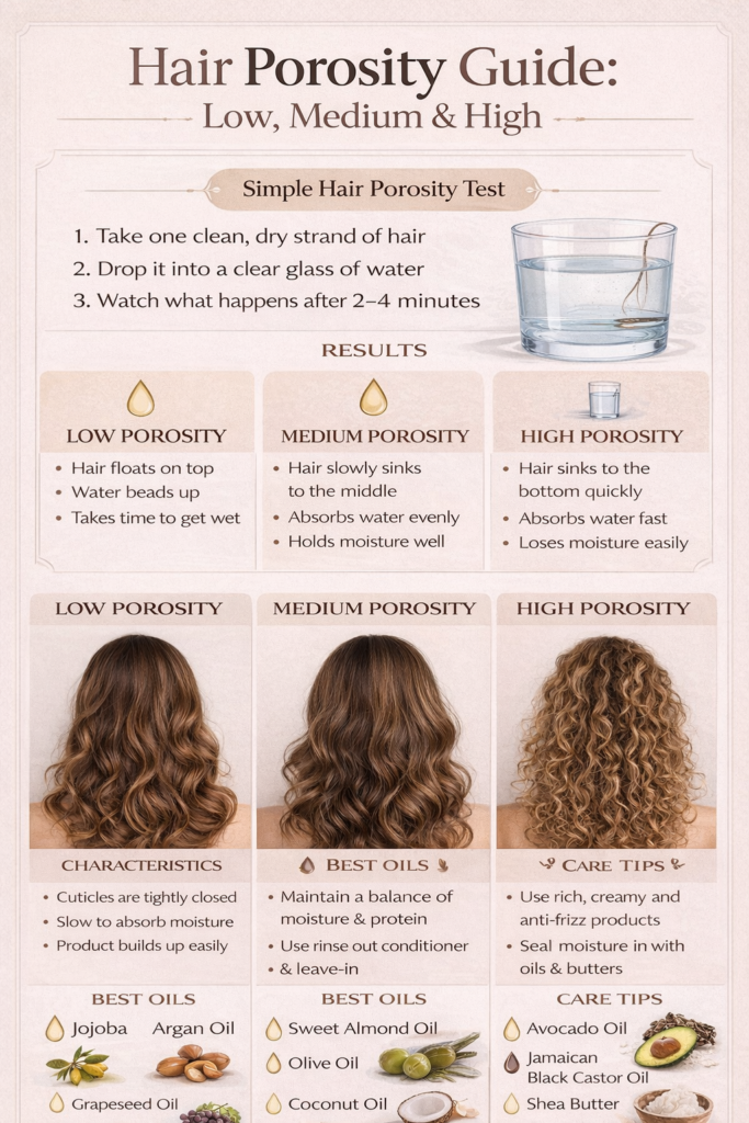 Not sure why your hair never reacts the same way to products? It all comes down to hair porosity. This guide explains low, medium, and high porosity hair, how to test your porosity at home, the best oils for each type, and simple care tips to keep your hair healthy, hydrated, and strong. Save this if you want to finally understand what your hair actually needs.