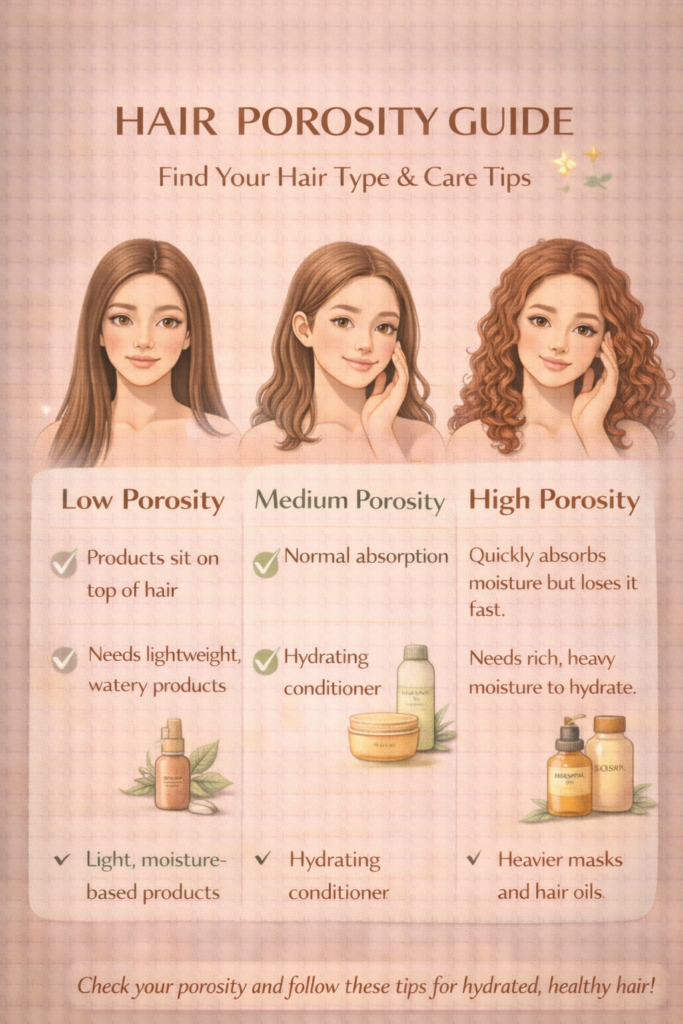 Not sure why your hair feels dry, oily, or hard to manage? Hair porosity shows how well your hair absorbs and keeps moisture. Low porosity hair needs lightweight products. Medium porosity hair stays healthy with normal hydration. High porosity hair needs deep moisture and oils to stay soft. Knowing your hair porosity helps you choose the right routine for stronger and shinier hair. Save this pin to understand your hair better โœจ #HairCareTips #HealthyHairRoutine #NaturalHairCare