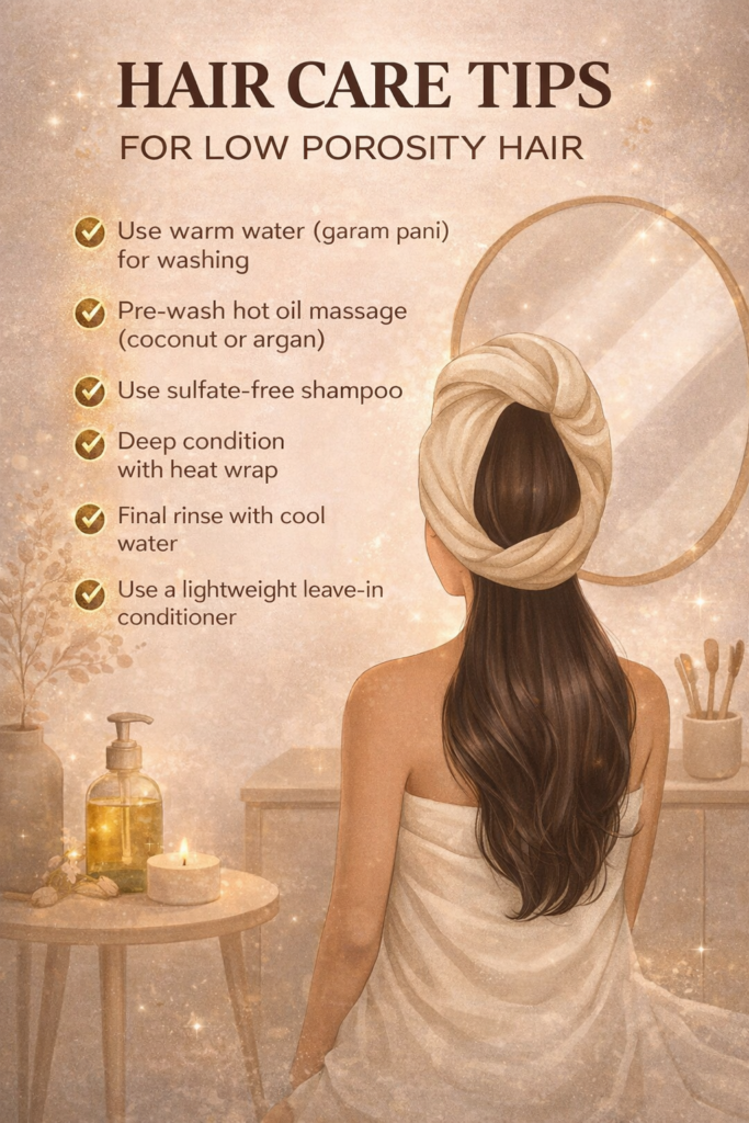 Struggling with dry, rough, or product-build up hair? This low porosity hair care routine shares the best expert-approved tips to keep your hair healthy, smooth, and shiny. Learn how to use warm water, oil massage, sulfate-free shampoo, deep conditioning with heat, cool water rinse, and lightweight leave-in conditioners for maximum moisture retention. Perfect for women dealing with frizz, dryness, or slow hair growth. Save this pin for an easy and effective hair care routine for low porosity hair.