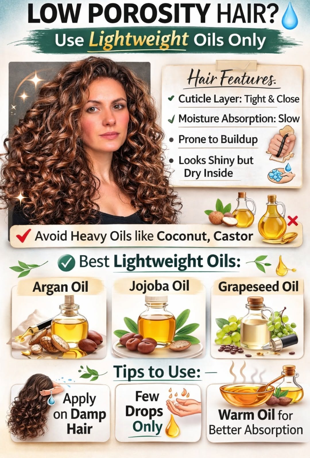 Kya aapke baal low porosity hain? Low porosity hair moisture absorb karne me time leta hai aur heavy oils se buildup ho sakta hai. Isliye argan oil, jojoba oil ya lightweight hair serum use karein jo frizz control kare aur shine de bina chipchipa feel ke 💛
