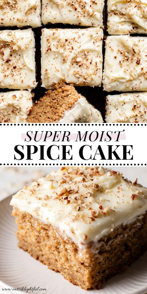 A MUST MAKE cake recipe for fall!! This spice cake is so unbelievably MOIST and full of toasty spice flavor in every bite. It’s super quick and easy to whip up and comes out perfect every time. It’s made with dark brown sugar, apple sauce, sour cream, and oil for an incredibly soft texture. Topped with a silky smooth cream cheese frosting and some chopped nuts, it’s the ULTIMATE warm and cozy cake! how to make spice cake from scratch recipe for spice cake recipes for fall cakes how to make spice cake at home homemade spice cream recipe easy spice cake recipe sheet cake recipes 9×13 inch cake recipes autumn spice cake recipe fall spice cake recipe #cakes #fall #baking #spicecake