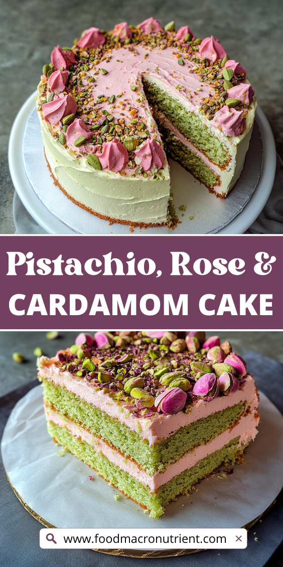 “Indulge in a beautiful fusion of pistachio, rose, and cardamom with this exquisite cake. It’s a unique blend of earthy and floral flavors that’s perfect for special occasions or tea time.”