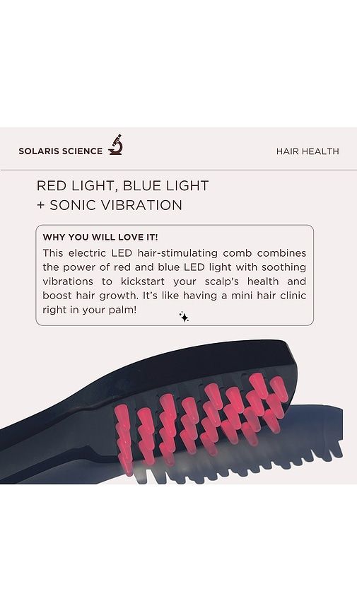 Solaris Laboratories NY Essential Scalp Therapy Set in Beauty: NA. Solaris Laboratories NY Essential Scalp Therapy Set in Beauty: NA. Refresh your hair care routine with the Essential Scalp Therapy Set. Use the silicone massager in the shower for a deep cleanse, then the LED brush post-shower, which emits red light at 630 nm or blue light at 450 nm, to promote scalp health and hair growth. Achieve healthier, stronger hair effortlessly.. Promotes a healthier scalp by providing a deep cleanse and reducing irritation Stimulates hair growth with red LED light at 630 nm. Supports thicker, stronger hair by improving scalp circulation Effectively removes dandruff and product build-up with the silicone massager. Built-in battery and USB cord included. In the shower, wet your hair and apply shampoo