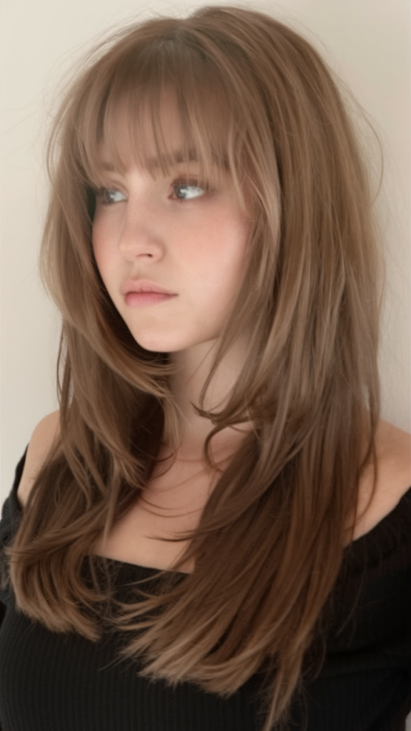 Soft, face-framing layers combined with wispy bangs are a timeless choice that exudes sophistication. The layers add movement and elongation, while the airy bangs soften the overall look, making it a match made in heaven for a round face. The subtle texture ensures that the style doesn’t overpower your features, creating a balance of elegance and casual charm.