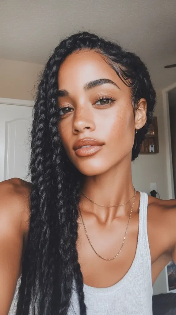 This hairstyle features long, beautifully braided hair that exudes both elegance and versatility. The braids are tightly woven, which not only adds texture but also creates a polished look. The hair cascades down one side, enhancing the overall silhouette and framing the face delicately. This style is perfect for various occasions, from casual outings to formal events. The sleek edges and minimal flyaways contribute to a refined appearance, making it an excellent choice for those seeking a chic yet low-maintenance look. Suitable for oval, heart, and square face shapes, this hairstyle balances proportions and highlights facial features beautifully. The braids also allow for a variety of styling options, including updos or leaving them down for a more relaxed vibe. This hairstyle celebrates natural beauty while offering a modern twist, making it a trendy choice for anyone looking to elevate their hair game.