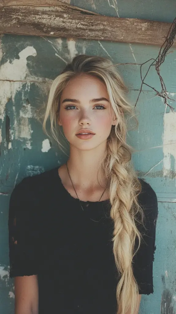 This stunning hairstyle features a long, loose braid that captures the essence of effortless bohemian chic. The braid is styled to appear relaxed and slightly tousled, giving a natural and carefree vibe. The texture is soft and flowing, with a hint of volume that frames the face beautifully. This look is ideal for those with medium to long hair, as it showcases the hairs natural movement and shine. The gentle waves leading into the braid add depth and dimension, enhancing the overall aesthetic. Suitable for various face shapes, this hairstyle particularly complements oval and heart-shaped faces, as the loose tendrils can soften angular features and draw attention to the eyes. Its versatile enough for casual outings or more formal events, making it a go-to choice for many. Whether paired with a simple t-shirt or an elegant dress, this hairstyle exudes a relaxed yet polished charm, perfect for any season.