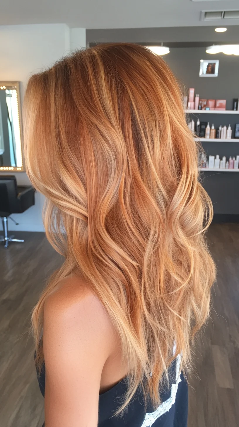 This stunning hairstyle features long, cascading layers that enhance the natural movement of the hair, creating an effortlessly chic look. The warm copper tones add depth and dimension, with a beautiful blend of lighter highlights that catch the light. The soft, beachy waves lend a relaxed vibe, making it perfect for casual outings or more formal occasions. The layered cut not only adds volume but also frames the face beautifully, making it suitable for a variety of face shapes, particularly oval, round, and heart-shaped faces. The texture appears soft and touchable, ideal for those seeking a low-maintenance yet stylish option. To achieve this look, a curling wand can be used to create loose waves, while a texturizing spray can enhance the overall volume and movement. This hairstyle is versatile, allowing for easy styling variations, whether worn down for a casual day or pinned up for an elegant evening event.