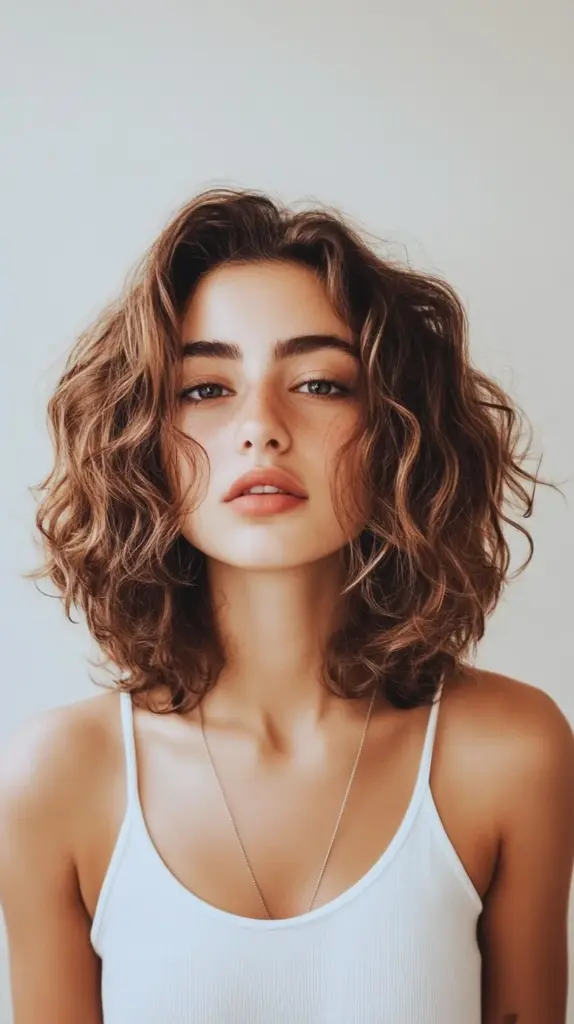 This hairstyle features beautiful, voluminous curly waves that exude a carefree and stylish vibe. The cut is medium-length, falling just above the shoulders, and is characterized by soft, layered curls that add dimension and movement. The texture is naturally tousled, creating a relaxed, yet polished look. The warm, rich brown color enhances the curls, giving them depth and a sun-kissed glow. This hairstyle works exceptionally well for individuals with wavy to curly hair types, as it embraces and enhances natural texture rather than straightening it. It is particularly flattering for oval, square, and heart-shaped face shapes, as the soft waves frame the face beautifully, highlighting the cheekbones and softening angular features. The versatility of this hairstyle makes it suitable for both casual outings and more formal events, allowing for effortless styling with minimal products. Whether you wear it down or pin back a section, this look is sure to turn heads and radiate confidence.