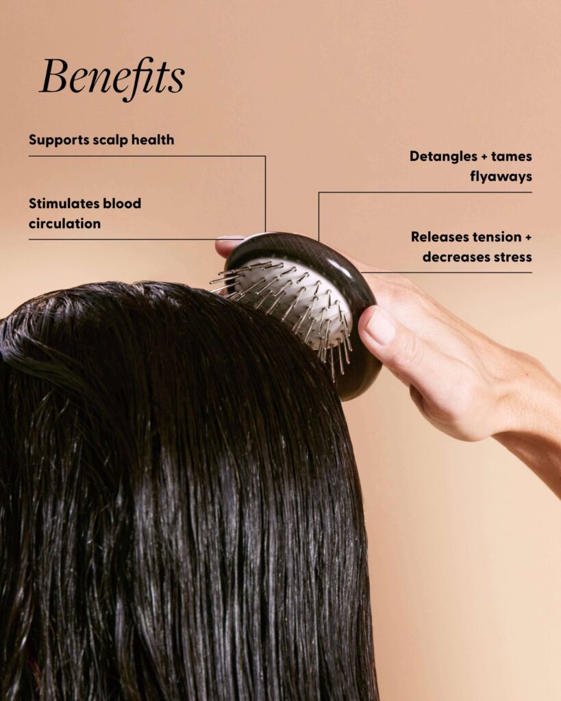 A stimulating scalp brush that supports hair health by increasing blood circulation which supplies the hair follicles with oxygen and nutrients to support healthy hair growth. Helps detoxify by removing oil and dead skin cell build up. Releases tension and decreases stress, which lowers cortisol levels.