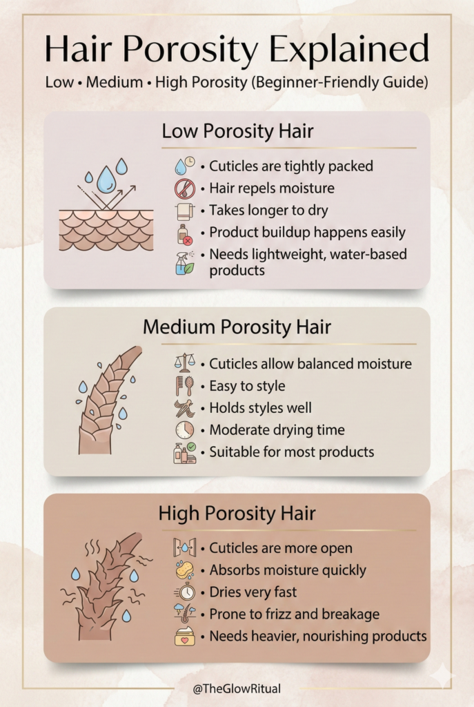 Learn the difference between low, medium and high porosity hair with this simple visual guide. Understand how your cuticles absorb moisture, how fast your hair dries, and which products work best for each porosity level. Perfect for beginners looking to build the right hair care routine. #haircare #haircareroutine #hairporosity
