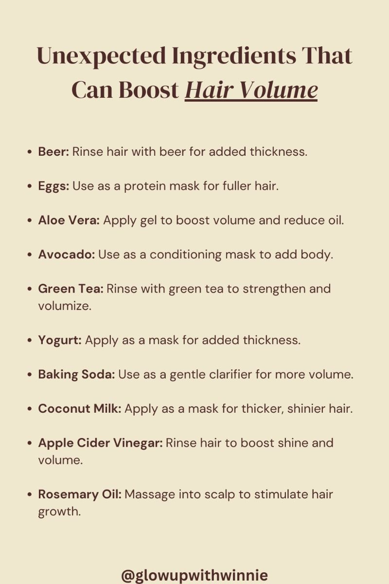 #hairvolume #naturalhaircare #volumizinghair #beautytips #haircarehacks #unexpectedingredients #beerforhair #eggprotein #aloe vera #avocadohairmask #greentea #yogurtmask #bakingsoda #coconutmilk #applecidervinegar #rosemaryoil #hairgrowthtips #hairnourishment #haircareguide #haircareessentials #beautyhacks #volumizingtips #selfcare #haircarecommunity #hairtips