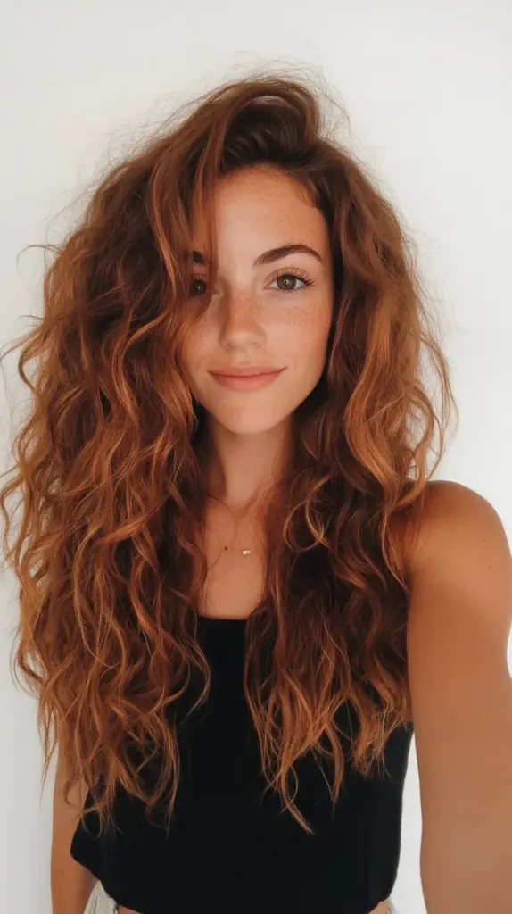 This hairstyle showcases a stunning mane of voluminous, free-flowing curls that exude a natural, effortless vibe. The rich, warm auburn color enhances the texture, adding depth and dimension to the look. The curls are soft and bouncy, creating a playful and lively appearance. The cut features layered lengths that frame the face beautifully, allowing for movement and versatility. This style works exceptionally well for individuals with wavy to curly hair types, as it embraces and enhances natural texture. It is particularly flattering for oval, heart, and square face shapes, as the layers soften angular features and add balance. To maintain this look, regular conditioning and curl-enhancing products are recommended to keep the curls defined and frizz-free. This hairstyle is perfect for casual outings or can be dressed up for more formal occasions, making it a versatile choice for any wardrobe.