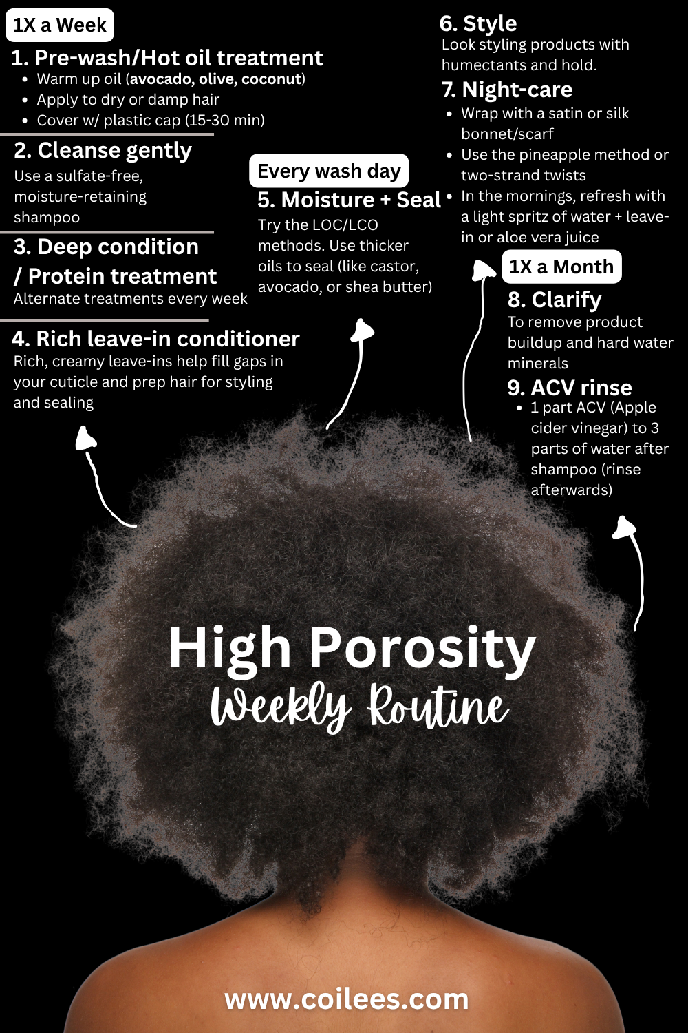 Struggling with dry, frizzy, high porosity hair? This weekly hair routine breaks it all down – hot oil treatments, deep conditioning, LOC method, and night care tips – to help you lock in moisture and reduce breakage. Perfect for natural, curly, 4C, and color-treated hair! #highporosityhair #naturalhaircare #4chairroutine #deepconditioning #curlyhairroutine #locmethod #texturedhair #moisturizehair #coilyhaircare #blackhaircaretips