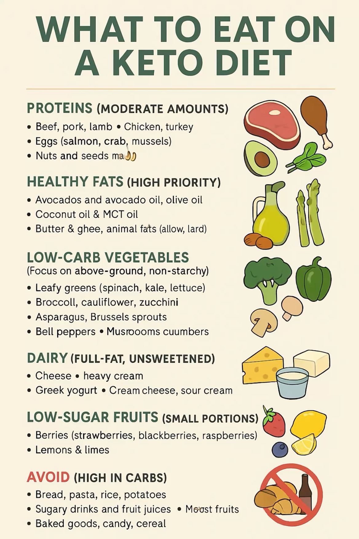 New to keto and not sure what to eat? This simple keto food guide shows you exactly what to include in your low-carb, high-fat lifestyle. Discover the best keto-friendly foods like healthy fats, low-carb vegetables, proteins, and dairy — plus what to avoid to stay in ketosis. Perfect for beginners looking to burn fat and lose weight on the ketogenic diet. Save this for your grocery list and meal planning! #KetoForBeginners #KetoFoodList #LowCarbLifestyle #WhatToEatOnKeto #KetoDietPlan #KetogenicEating#ketodieta #ketotablets #ketoguru